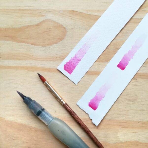 Lo hermoso del brush pen recargable para empezar a pintar con acuarelas te va a ayudar a ejercitar mucho tu control del agua sin la necesidad de requerir de un frasco con agua para mantener húmedo el color que estés pintando en la hoja. Te simplifica mucho la vida porque ya no tenés que ir y venir constantemente entre tu hoja, tu paleta y el agua para recargar tu pincel de humedad y seguir pintando.